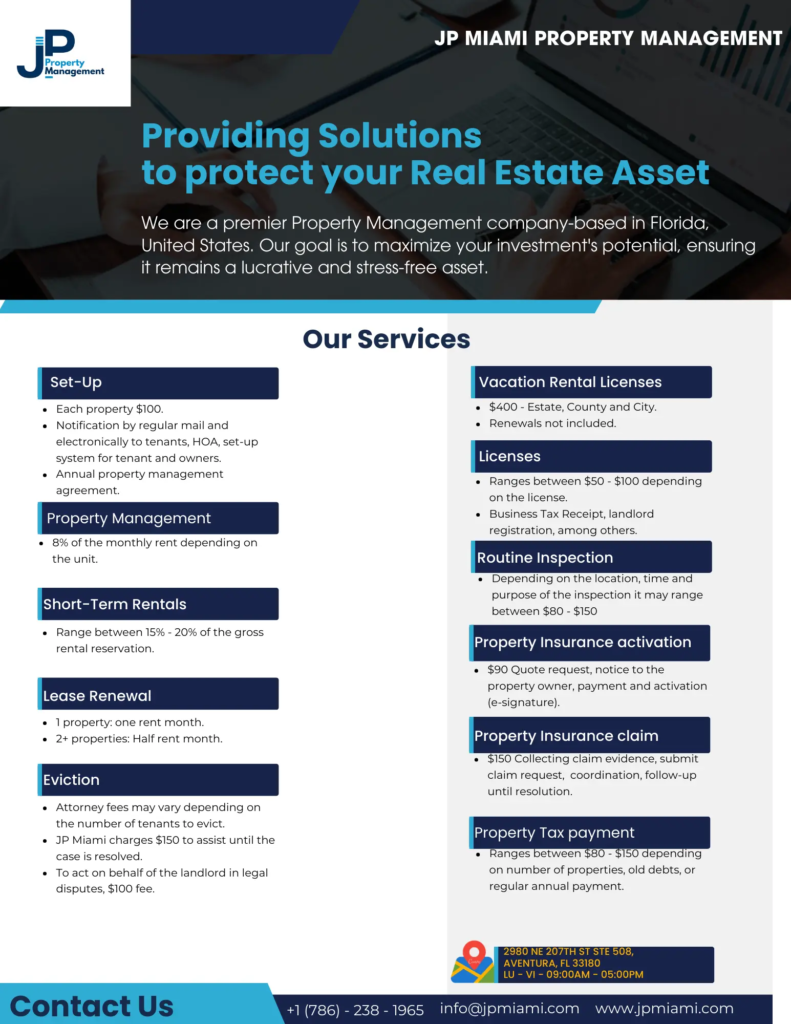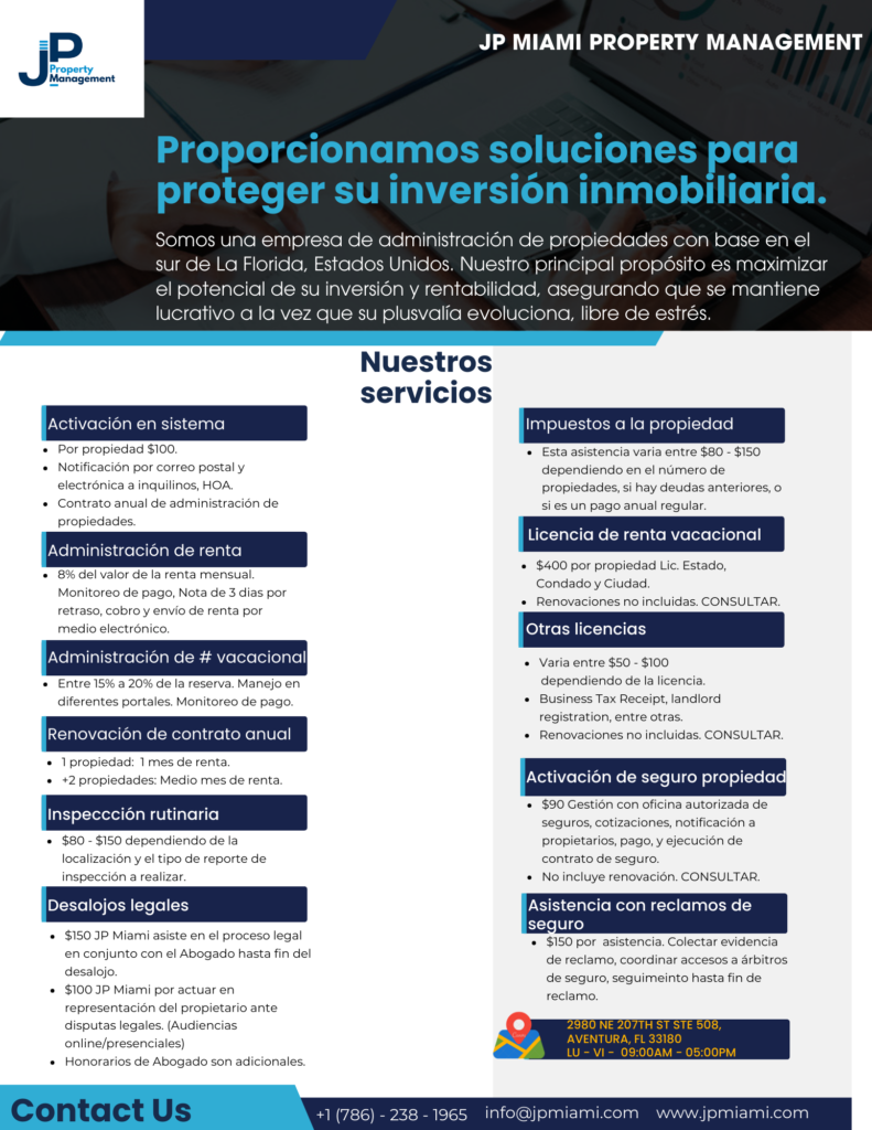 Somos un equipo experimentado y con amplía trayectoria en la industria de bienes raíces en Estados Unidos, con especialidad en el mercado de La Florida. JP Miami Property Management ofrece un servicio integral que te acompañara a incursionar como inversor en Estados Unidos o bien a representarte en tu trayectoria como propietario,  aliviando la carga de responsabilidades que conlleva dirigir una o varias propiedades. Cuidamos tu patrimonio, te representamos en la relación con el inquilino, y con la Asociacion de propietarios donde se sitúe tu propiedad, somos conocedores de las regulaciones locales y ayudaremos a que tu patrimonio inmobiliario esté en regla según las ordenanzas municipales, de condado y estatales. Contamos con una extensa red de profesionales de diferentes ámbitos vinculados al sector de bienes raíces, y todos estamos aquí para contribuir en tu crecimiento.